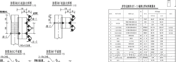 以三波形護(hù)欄BT端頭圖紙為例,我們可以看到其結(jié)構(gòu)特點(diǎn)包括:梁板采用波浪形設(shè)計(jì),以增強(qiáng)其抗沖擊能力;端部翼墻采用特殊形狀,以實(shí)現(xiàn)與混凝土護(hù)欄的平滑過渡;此外,還需考慮梁板與路肩或中央分隔帶的連接方式,以確保整個(gè)護(hù)欄系統(tǒng)的穩(wěn)定性和可靠性。