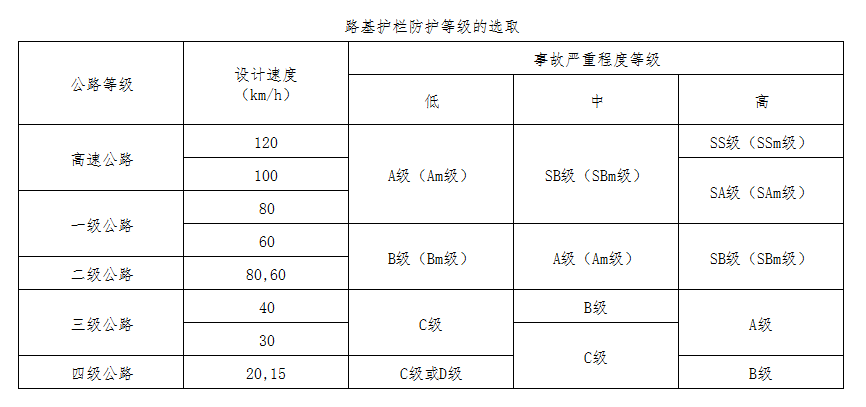 事故嚴(yán)重程度等級是判斷護(hù)欄防護(hù)等級選取的重要前置條件,同時也相關(guān)護(hù)欄設(shè)置必要性的判斷條件,當(dāng)?shù)燃墳?/span>“高”時,必須設(shè)置護(hù)欄,當(dāng)?shù)燃墳椤爸小睍r,應(yīng)設(shè)置護(hù)欄,當(dāng)?shù)燃墳椤暗汀睍r,宜設(shè)置護(hù)欄。