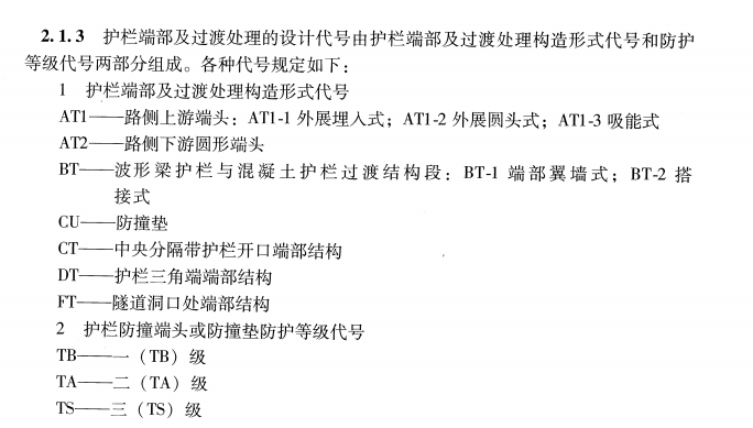 現行的公路護欄端頭主要有7大類構造形式、3種防護等級。各護欄端頭類型代號如下: