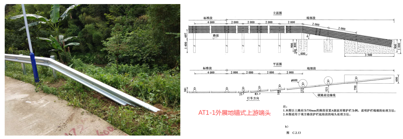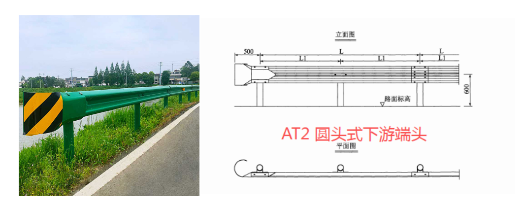 2) 行車方向下游端頭可采用圓頭式可與標準段護欄成一直線設置。二級公路考慮對向交通駛出路外碰撞的可能性,也可做成外展圓頭式。